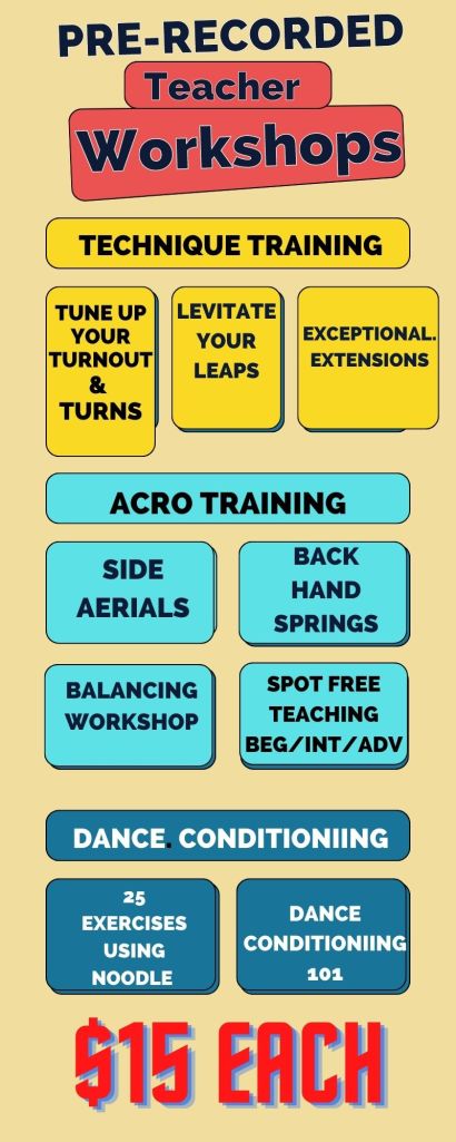Workshops for Teachers! The one hour workshop provides registrants an opportunity to learn skills, drills, spotting techniques and ask questions while I lead the workshop with a student to give a hands on experience. In the private group, I also post support materials that teachers can print and bring to their classroom to share with students. The the entire workshop is recorded and available to all paid registrants ($15). This format has been helpful for teachers to get the information on specific topics of interest. Available workshops: Cartwheels-Side Ariels, Back Bends- Back Handsprings, Spot free teaching (3 levels: Beg/Int/Adv), Balancing, Levitate your Leaps, Tune Up Your Turnout & Turns, Elevate Your Arabesque, Exceptional Extensions, 25 Conditioning Exercises, Dance Conditioning 101 & more to come!